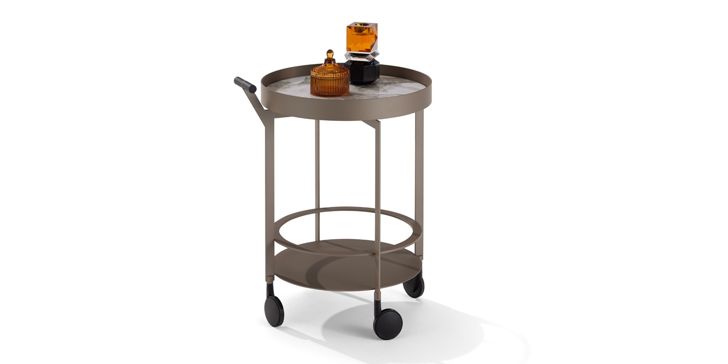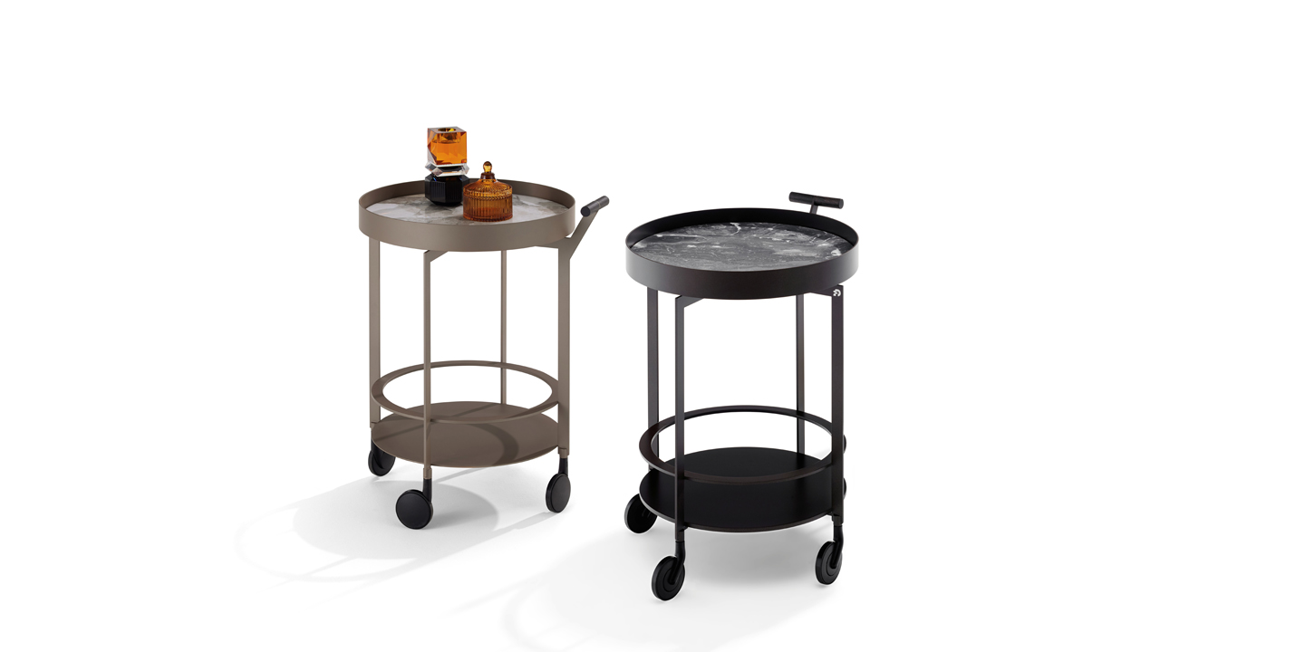 The fine edge formation of the metal corpus and the trays of natural stone or coated metal lend a high-class appearance. With the wooden handle and its elegant castors, the table can quickly be positioned where it is needed.