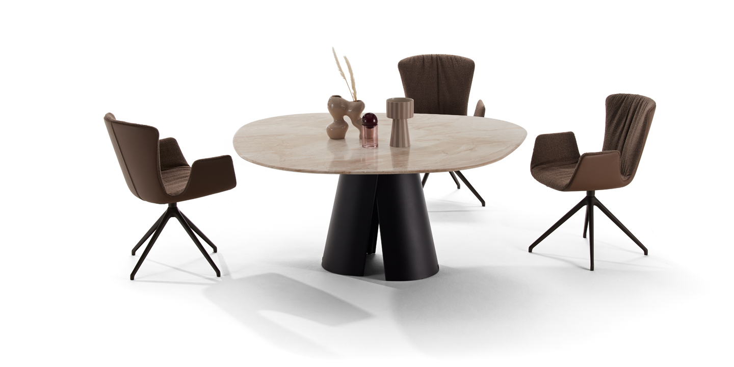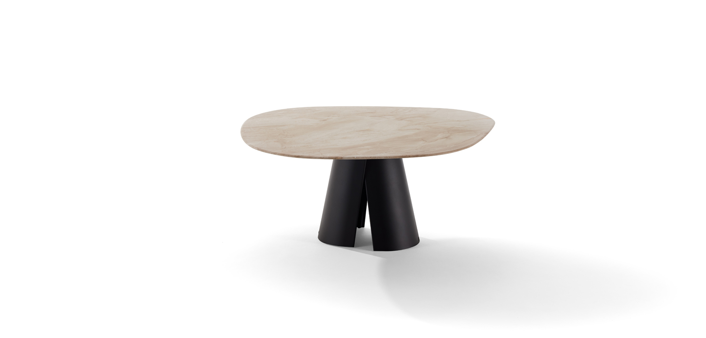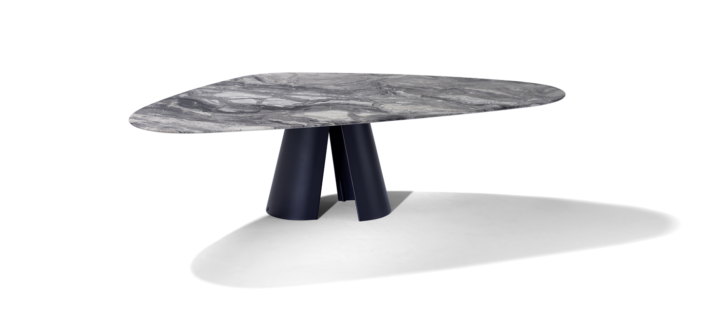 KENT is an exciting new way to experience a table. The partly asymmetrical tabletops createnew seating arrangements and thus open up new perspectives for the guests sitting at thetable. The fascinating thing about the KENT idea is that it first creates e xciting asymmetricalshapes and then to find a harmonious balance through carefully considered arrangements.The stone finishes almost appear more elegant due to the asymmetry of the tabletops andconvey an impressive aesthetic experience thanks to their v eining and color. The tableconcept opens, beyond from the banal routine of symmetry, towards new inspiring andcommunicative situations.In combination with the baseconsisting of two half shells made of cast aluminum eachshape of the tabletop has an overall sculptural appearance that makes the KENT look verylight and delicate.