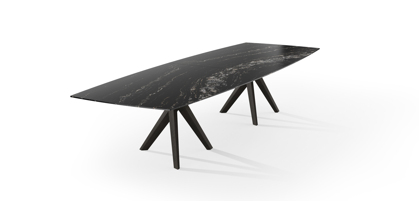 Die Tischplattenform des Trilope ist abgeleitet vom „Reuleaux-Dreieck“ (auch bekannt als „Gleichdick“ oder „Wankelform“). Dieser Grundriss wurde nach allen Regeln geometrischer Kunst gestalterisch so abgerundet und verfeinert, sodass die weiche Erscheinung der Platte zum Verweilen am Tisch einlädt - ganz ähnlich der eines runden Tisches, aber mit neuartiger Optik und mehr Präsenz und Raffinesse. Der Unterbau besteht aus drei markant profilierten Massiv-holzteilen, die tangential miteinander verbunden sind und somit nicht nur ein faszinierendes Erscheinungsbild bieten, sondern darüber hinaus auch höchste Stabilität erreichen. Unterbau und Tischplatte gehen hier eine vollendete ästhetische Verbindung ein und wirken so von allen Seiten wie eine prägnante und fesselnde Skulptur im Raum.