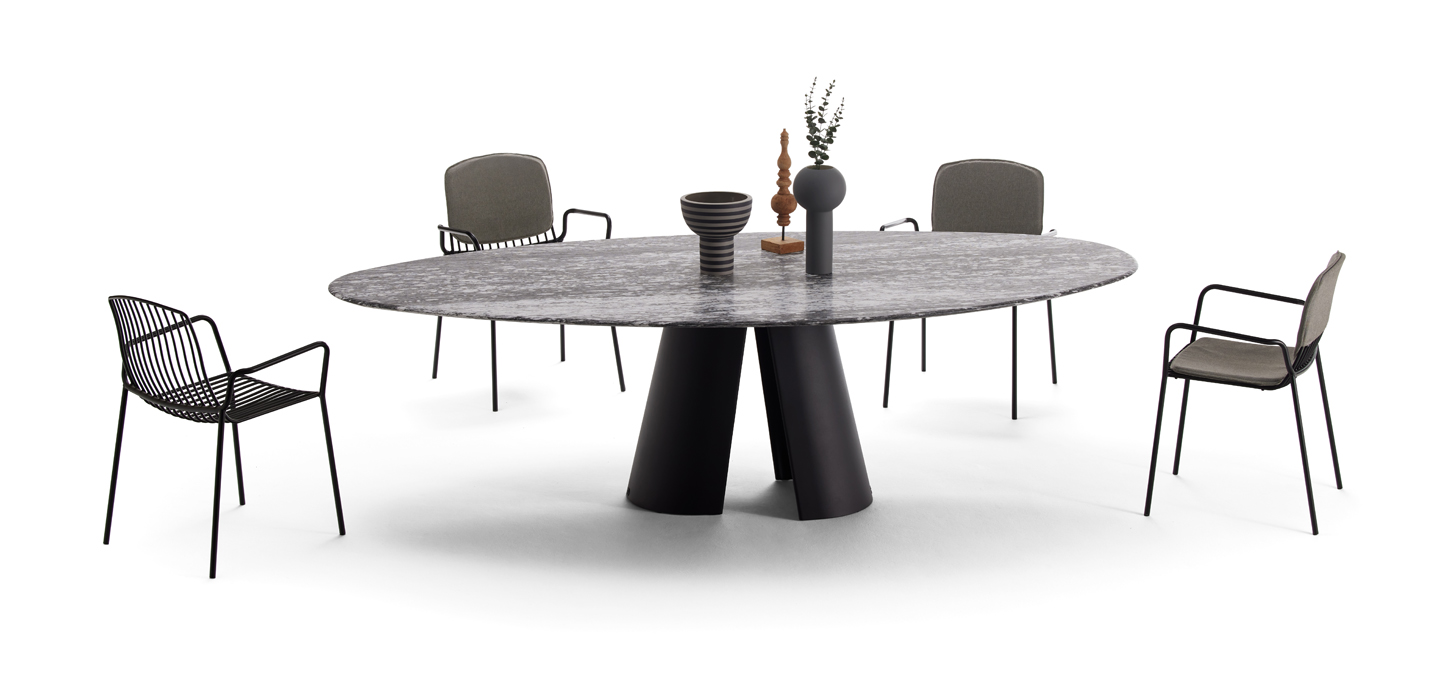 What sets new standards in the interior also enriches the outdoor area.Here, too, we don't want to do without an exciting table shape with a surprising seating arrangement. Oval, pebble, trilungo or trapeza? Which suits your terrace better?