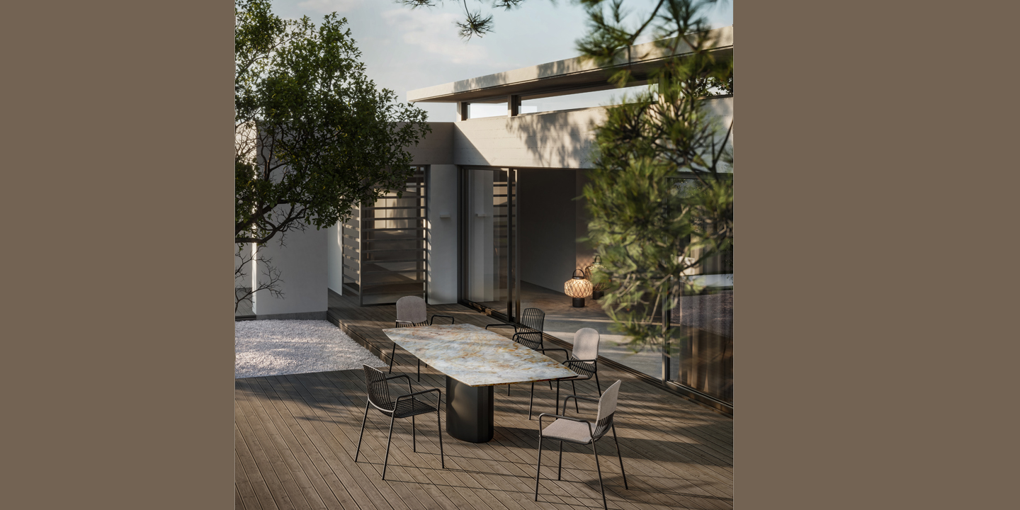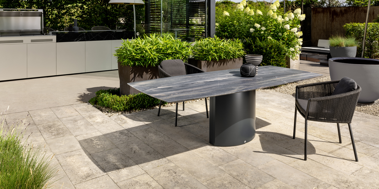 Die Eleganz und Raffinesse des Klassikers unter den Stein-Esstischen ist nun auch für den des Outdoor-Living- Bereich weiterentwickelt worden.